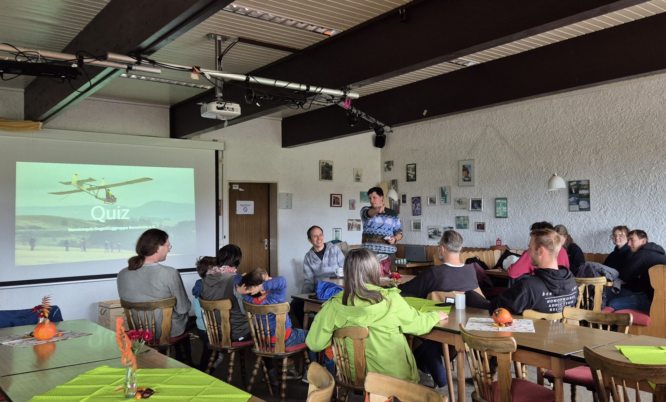 Den traditionellen Ziellandewettbewerb zum Saisonabschluss vereitelten feucht-windigen Wetterprognosen. Aber Organisator Andreas Weskamp veranstaltete kurzerhand ein spannendes Quiz im warmen, trockenen Vereinsheim zur Ermittlung des „Kürbiskönigs“. In heiterer Runde kämpften zwei buntgemischte Mannschaften mit kniffeligen Fragen zur Geschichte des Vereins und zur Segelflugpraxis – solange, bis jemand feststellte: „Es regnet nicht. Hey, das sind welche eifrig am Hang unterwegs!“