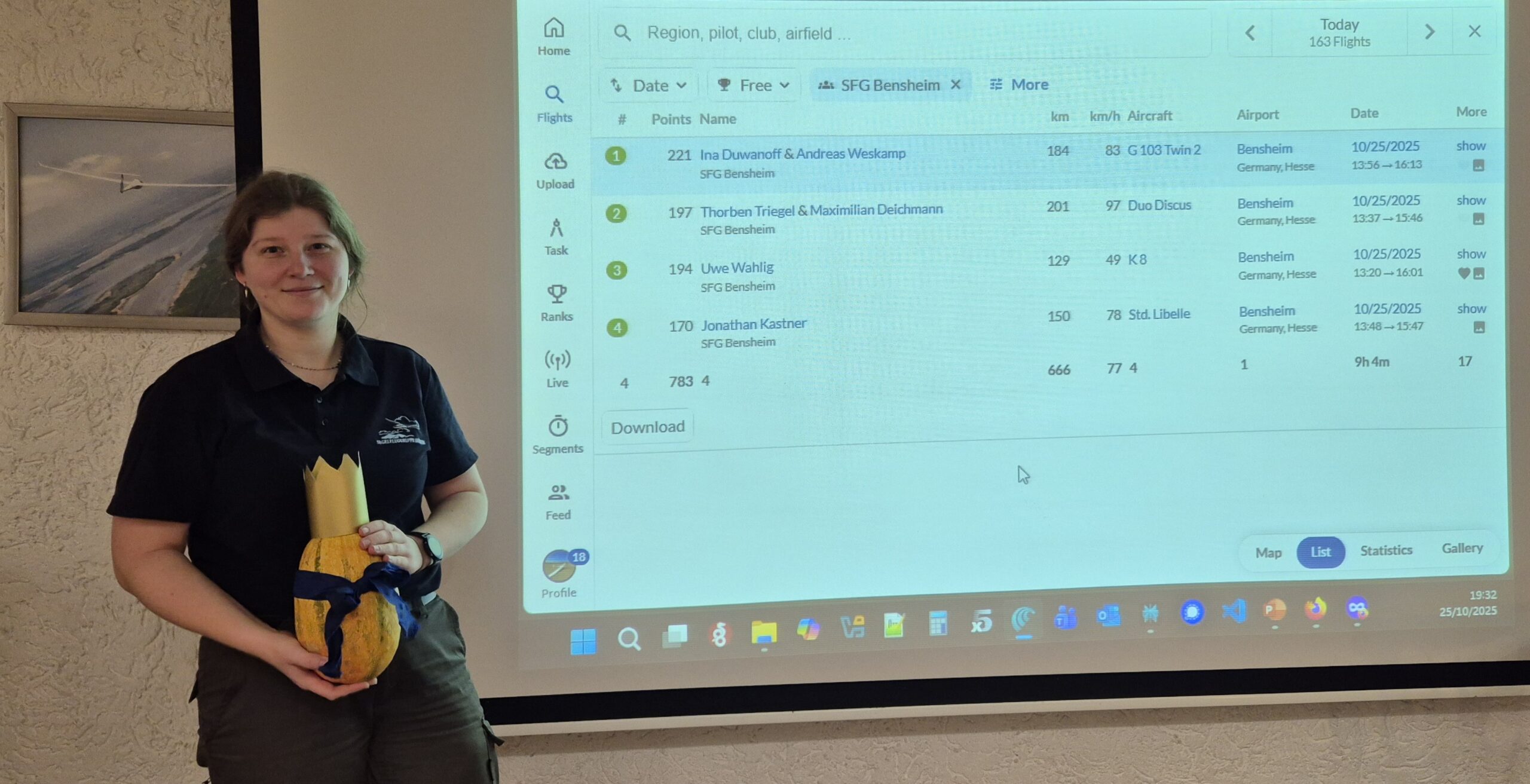 Schlagartig war die Indoor-Veranstaltung beendet, zügig der Flugbetrieb aufgebaut und flugs starteten fünf Teams Richtung Bergsträßer Hang. Am Abend stand schließlich der bzw. die Siegerin des „Kürbisturniers“ fest: Ina Duwanoff hatte mit Copilot Andreas Weskamp (außer Konkurrenz) den Bensheimer Tagesrekord von 221 Punkten (mit 184 km) in der Weglide-Wertung erflogen (und damit gleichzeitig bundesweit Platz 5 in der Tages-DMSt-Wertung errungen). Müde, aber glücklich nahm sie die Insignien der „Kürbiskönigin“ entgegen. Weltmeister Uwe Wahlig stellte einen weiteren Tagesrekord auf: Langsamflug 15 km/h. Er freute sich: „Es ist bestimmt 35Jahre her, dass ich mit einer Ka8 am Hang nach Heidelberg geflogen bin.“ Gemeinsam genossen alle die heiße, wärmende Kürbissuppe nach einem erlebnisreichen Tag .